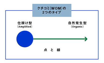クチコミマーケティングには、大別すると「仕掛け型(Amplified/直訳は『拡声器を使った』)」と、「自然発生型(Organic/有機的な)」の2つのタイプがある。前者は何らかの話題提供や仕掛けを用意して、短期的にクチコミを最大化するもの。後者は、既存顧客を中心に中長期的にじわじわと広がるクチコミを指す。前者は「大きな点」で、後者は「線」のようなものとたとえられる(図2)。クチコミはきっかけがなければ発生さえしないという意味では「大きな点」作りは欠かせないし、発生したクチコミが瞬間で終わってしまっては、せっかく関心を持ったターゲットとの関係構築が十分ではないという意味で「線」を長く保つ工夫も重要となる。商品カテゴリやターゲット、目的や予算などに応じても変わってくるが、基本的にはこの「できるだけ大きな点」と「できるだけ長い線」をいかに組み合わせたプランニングができるかがポイントとなる。