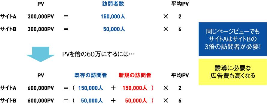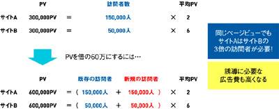 このとき仮に「ページビューを2倍にしたい」と考えて広告を出すとすると、前者は訪問者を15万人増やさなければならないのに対して、後者は5万人増やすだけで良いことになる。広告から訪れる人が見てくれる平均ページ数がこれまで通りとは限らないが、少なくとも計画上はそういうことになるだろう(図3)。想定しなければならない広告予算は、1クリック10円としても
