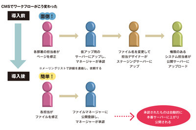 CMSを導入して、サイト運用のワークフローは大幅に変わっていった。各担当がファイルを作り、FILE MANAGERに公開登録。承認を受けると、本番サーバーにアップされる。この3段階の手順ですべて完了だ。