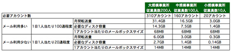 このような条件で、必要なディスク容量(全体でのディスク容量と、1メールアドレス当たりのディスク容量)、月間転送量、必要メールアドレス数を計算した結果をまとめたものが表1「事業所規模・メール利用頻度別のリソース利用量」となる。