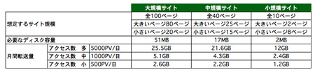 その結果をまとめたものが表2「サイト規模別のディスク使用量と転送量」になる。