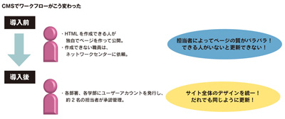 バラバラだったサーバーも1つになり、編集作業もかなり楽になった。また、公開期間やページタイトル、所有者ユーザーで管理コンテンツを検索する機能があるので、問い合わせに対して、担当者以外の人でも簡単にページを見つけることが可能。この機能はネットワークセンターで役立っているという。