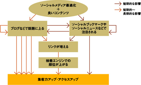 また、ソーシャルブックマークやブログなどでは、話題にのぼるたびに参照としての被リンクを集め続けるが、これはSEOにおけるリンク数の増加につながり、結果として検索エンジンでの順位のアップにもつながる。こうしたさまざまな効果によって、SMOはサイトに巨大なトラフィックをもたらすのだ。