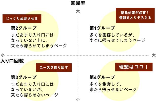 図の右上、第1グループに属するページは、「多くを集客しているが、すぐに帰らせてしまうページ」。集客力が高いだけに非常にもったいないページだといえる。しかし、そのページに集客力があること自体は悪いことではないので、直帰率を下げ、図で下に向かって移動するように対策を行う。