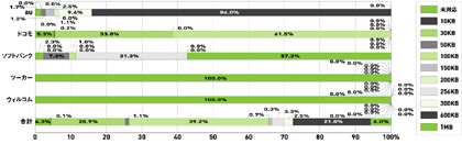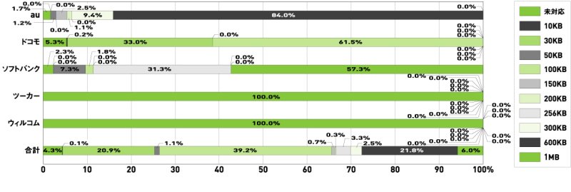 最初にアプリケーションを搭載した503iでは最大容量が10KBにすぎなかったが、年々大容量化が図られており、ソフトバンクからは1MBの端末も発売されるようにもなっている。アプリケーションの最大容量別にアクセスシェアを見ると、auでは600KBが84%、ドコモでは100KBが61.5%、ソフトバンクでは1MBが57.3%を占めている。