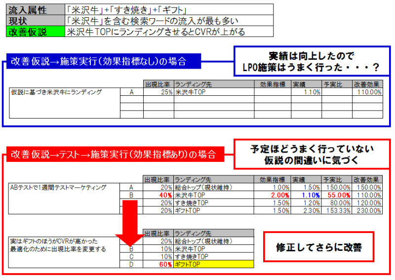 この行動仮説や効果指標を明文化して認識しているかは、LPOにおける重要なポイントである。たとえば、次のような仮説を立てたとする。