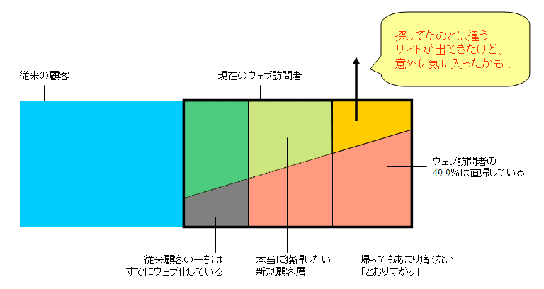 新規訪問者側については、エリアが4つに分けられている。つまり、直帰者と直帰しなかった人、という上下の区分の他に、左右にも2つに分けてある。それは「顧客になってくれそうな人」と「まったくの通りすがり」である。