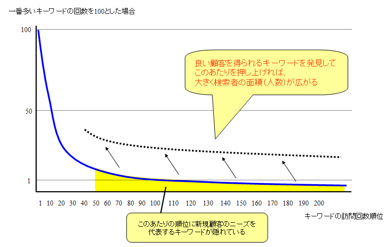 私の解析経験からいうと、一番多いキーワードを100とすると、100番目のキーワードが1ぐらいになっていることが多い。つまり、会社名で1,000回検索訪問者があれば、100番目のキーワードでも10人ぐらいは訪れていることになる。