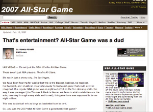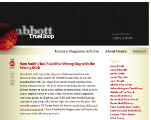 True Hoopは、スポーツライターのHenry Abbott氏の個人ブログ。プロのライターとしての経験があり、有名なスポーツ雑誌の巻頭記事の執筆経験もあるので、ブログエントリーといっても内容はすばらしいものばかり。Forbs.comから2005年度のBest of the Webにも選ばれたこともあり、知る人ぞ知る良質のスポーツブログという存在だったといえます。このTrue Hoopが2月に買収され、Abbott氏はESPNのライターとしてチームに加わったそうです。ブログによれば、ESPNの買収後も変わらない運営を行うということですが、取材費用もESPNから賄われ、過去の記事や写真も利用できるようになるようなので、今後何かしらの変化が見られるかもしれません。