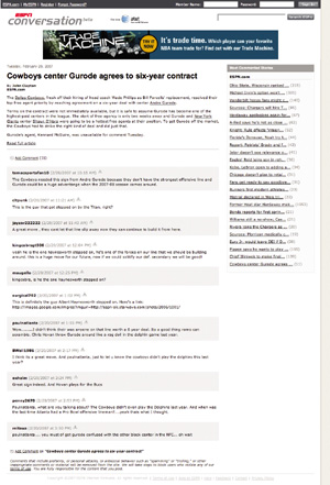 ブロガーをESPNのネットワークに取り込んだわけですが、ESPNではさらに一般ユーザーにも手を広げ始めています。ESPNが提供しているヘッドラインニュースすべてに「ESPN Conversation」というコメント機能を実装し、公式のニュースに直接コメントが書き込めるようになっています。話題のニュースになるとコメント数は2000件にものぼり、早くも効果が出ているようです。ここ1年ほどアクセス数が下降気味になっているESPN.com。個人の情報発信を尊重し、それを上手く取り込むことによってアクセス数や登録メンバー数を伸ばすことができるのでしょうか。こうしたオープン戦略が鍵を握っているかもしれません。