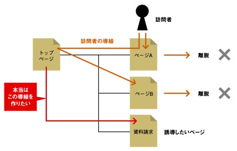 ページAには集客力があるが、期待するページに訪問者を誘導する仕組みがない。ページBも人を帰らせてしまっているページだ
