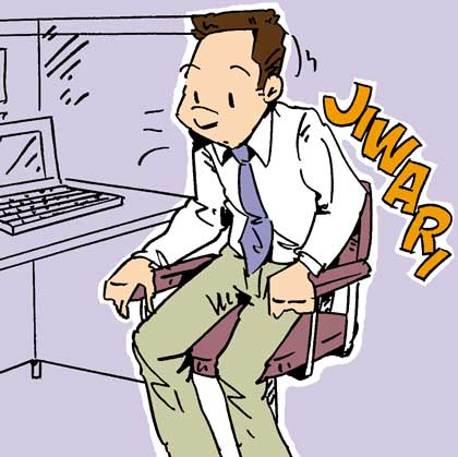 息を吐きながらゆっくり椅子から立ち上がり、おしりを少し突き出すようにして腰かける。手は腰掛けに!