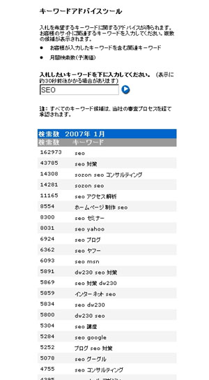 このキーワードアドバイスツールを使って、思いつくキーワードの人気度=検索数を調べていく。この際、できれば月間検索数が千件以上の人気の高いキーワードを最初に100種類以上選んでおきたい。