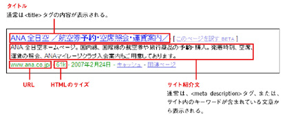 検索エンジンのための特別なHTMLタグ「<meta>タグ」がある。<meta>タグには「<meta keywords>」と「<meta description>」という2つのタグがあるが、検索エンジンは<meta keywords>よりも<meta description>タグの方を重要視している(Googleは現在はそれほど重視していないと言われているが、Yahoo!やMSN Live Searchは依然評価の対象としているようだ)。ここにはサイトの説明文を書くのだが、できれば2~3個のキーワードを入れておきたい。