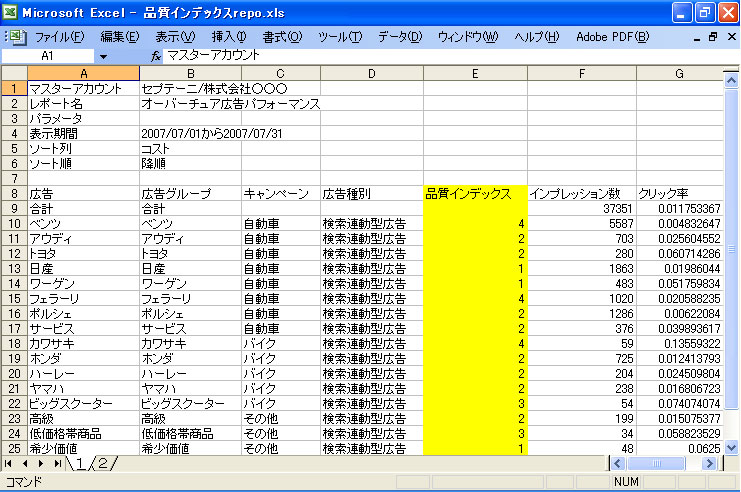 ここまでに解説した手法を実施したなら、各広告の品質インデックスを検証してみよう。それには、広告パフォーマンスレポートとExcelを使うのが簡単だ。