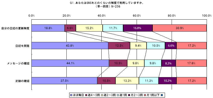 Q7でSNSの利用頻度(単一回答)を聞いたところ、「日記の閲覧」「メッセージの確認」というSNSの機能について、SNS利用者の約45%弱がほぼ毎日閲覧していることがわかった。また、18.8%がほぼ毎日日記を更新していることがわかった。