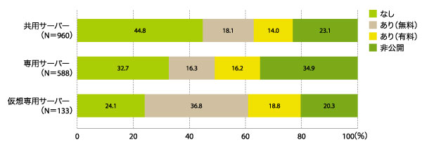 これを代行してくれるのは、共用サーバー5割弱、専用サーバーでは8割弱、仮想専用サーバーでは8割以上が対応しているが、ほとんどが有料での対応となっている(グラフ14)。