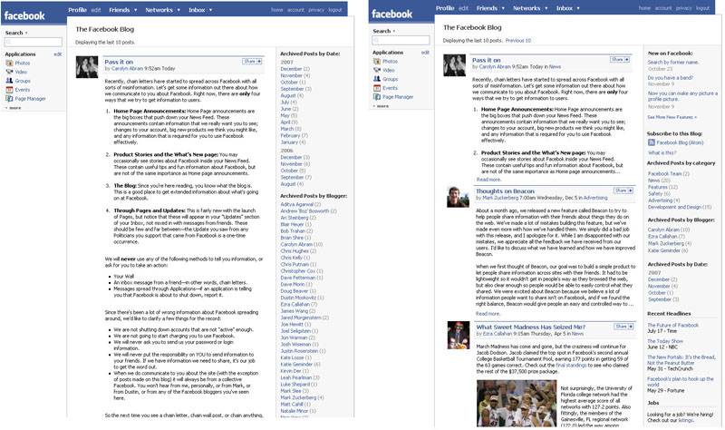 サイドバーの話に戻るわね。Facebookの新着情報(What's New)ページでは、サイドバーに、最新ニュースのヘッドライン(ニュースサイトに掲載されたFacebook関連記事の見出し)と、同社の求人募集のリンクがある。これをどうしてブログのサイドバーにも載せないのか理解に苦しむわ。だって、ニュースのヘッドラインって特にブログと関連性があるでしょ。