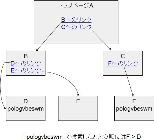 ステップ5:グーグルが、これらすべてのページをインデックス化するのを待つ(新ドメインのホームページに張ったリンクが少なければ、通常2~3日しかかからない)。そして、ページ(D)とページ(F)で設定した無意味なキーワードを検索してみる。すると、ページ(F)が上位にランクされる。なぜなら、ページ(D)はページ(B)のリンク価値をページ(E)と分け合っているのに対して、ページ(F)にはページ(C)からすべてのリンク価値が供給されており、ページ(D)よりも多くのリンクジュースが流れてくるからだ。