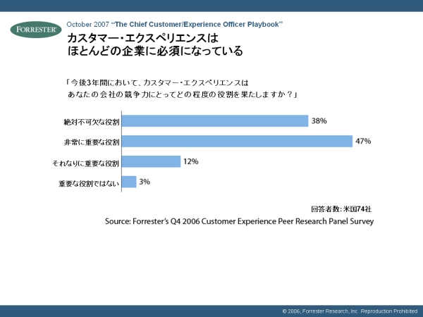 2006年にフォレスターが米国で行ったインタビュー調査では、「今後3年間において、カスタマー・エクスペリエンスはあなたの会社の競争力にとってどの程度の役割を果たしますか?」という質問に対し、「絶対不可欠」だと答えた企業は38%、「非常に重要」だと答えた企業は47%という結果がでました。85%の企業が、カスタマー・エクスペリエンスは大事な役割を持つと考えているわけです。