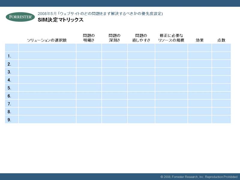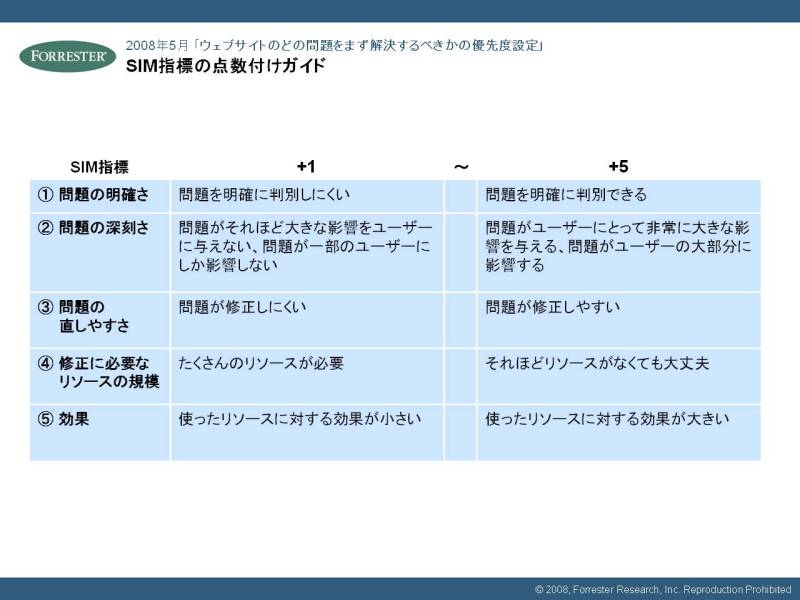非常に多くの問題に直面しているWeb担当者は、それを日常的に管理、改善するのにとても苦労していることでしょう。そして、ROI(費用対効果)を向上するいろいろな方法を制作会社やコンサルタントから紹介され、それを検討していることでしょう。そこで、このSIMのような明確でシンプルな表を作ることによって、何をどの順番で改善すべきか整理して、迅速にプロジェクトを遂行できるようになります。