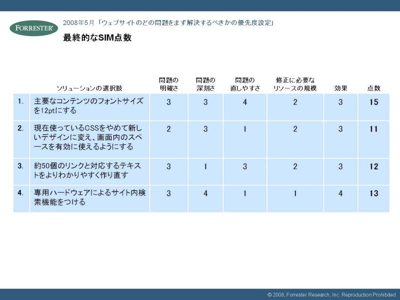 結果として、合計点数が最も高い「主要なコンテンツのフォントサイズを12ptにする」をまず実行して文字の読みにくさを解決するのが、費用対効果が高い選択肢だということがわかります。