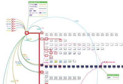サイトグラムでは、基本的に5つのレポートが出され、きめ細かな分析を行える。戦略地図として利用できるレポートの「サイト構成図」では、ウェブページのサムネイル画像が入ったホームページの構成図上にログ解析の結果がプロットされ、動線などの全体の動きをチェックすることが可能。会議やプレゼンのほか、今後の戦略を立てるのにも利用できる。ページ経路をビジュアル化した「重点ページ」では、特定のページに入る動線と出る動線をピンポイントで表示。コンバージョンポイントとなるページや重要なページを指定して、各ページの詳細やキーワードの傾向を読み取ることができる。