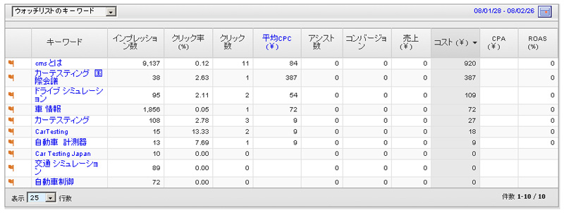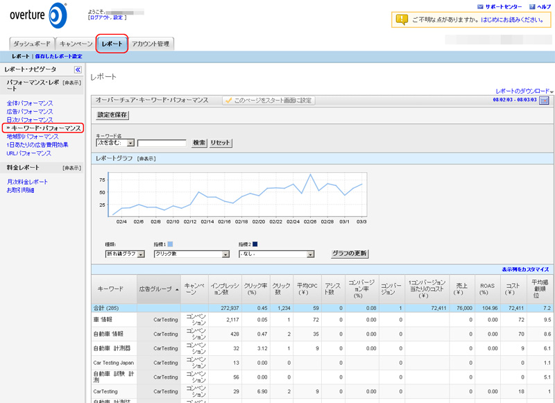キーワード・レポートでのチェックポイントも、基本的には「広告パフォーマンス」と同じです。インプレッション数やクリック数でトレンドをつかみ、クリック数との関係で平均CPC、平均掲載順位、コンバージョンを見ていきましょう。成果が思わしくないキーワードは、掲載を停止したり削除したり、所属する広告グループを移動したりしていくと、広告の品質を高めることにもつながります。