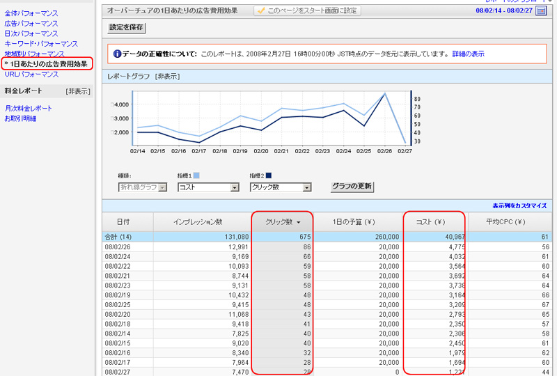 1日の予算と実際にかかっているコストの両方を一覧表示します。この画面ではグラフにクリック数とコストを表示しています。(画像はクリックで拡大)