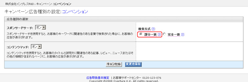 ![3.右の[検索方式]の欄で[完全一致]を[部分一致]にします。部分一致を選択すると完全一致と部分一致の両方が適用されます。](/files/images/article2008/overture_officialguide/overture7_04_03m.jpg)