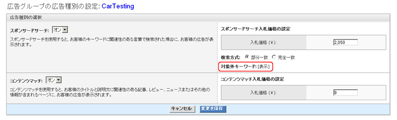 対象外キーワードの設定は[広告グループの設定]→[広告種別の設定]と進んだあと、「対象外キーワード」テキスト領域で、広告グループの対象外キーワードを1行に1つずつ入力します(右の画面参照)。なお、対象外キーワードはアカウント単位でも設定できます。この場合は[アカウント管理]タブから[広告種別の設定]の[編集]をクリックして行います。