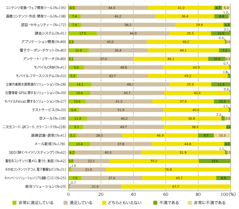 悩めるウェブ担当者が「即効性の高いケータイマーケティングソリューション」を見付ける手引きとなるよう、各ソリューションに対する満足度を見てみよう。「非常に満足している」「満足している」の合計が高いのは「認証・セキュリティー」「課金システム」「企業内業務支援関連のソリューション」となっている。一方低めなのは「画像認識・読取」「着信系コンテンツ」など(図9)。利用したい各ソリューションの用途4パターン(図5)と組み合わせて考えれば、自社のケータイサイト像を明確にしたうえで導入しやすいだろう。