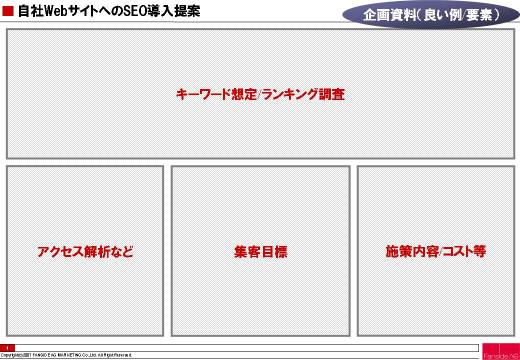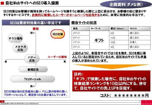 今回はダメな企画というよりは要素が不足している企画である。SEOの手法が他の手法と比べすぐれていることと競合他社がSEO導入をしていることを強調している。要素としてまったく必要ないわけではないが、数値的な現状分析や根拠がないので上司を説得できる可能性は低いだろう。