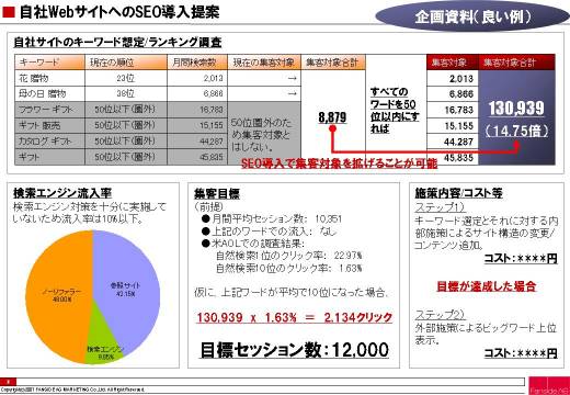 後に示す良い企画書の例では、「SEOによって集客対象が14.75倍も拡がること」をわかりやすく表現している。ただ、ここで勘違いしてないでいただきたいのが、クリック数やセッション数が14.75倍になるわけではないことだ。あくまでも集客対象が拡がるという説得のための見せ方だということを忘れないでほしい。