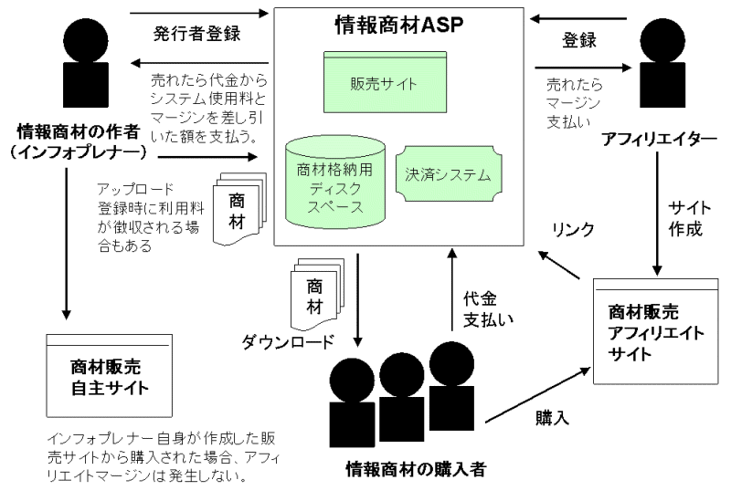 商材の作成者(業界では「インフォプレナー」と呼ぶ)自らがオークションなどで直接販売するケースもあるが、情報商材販売専門のASP(アフィリエイトサービスプロバイダー)に委託し、アフィリエイター経由で販売している場合も多いようだ。