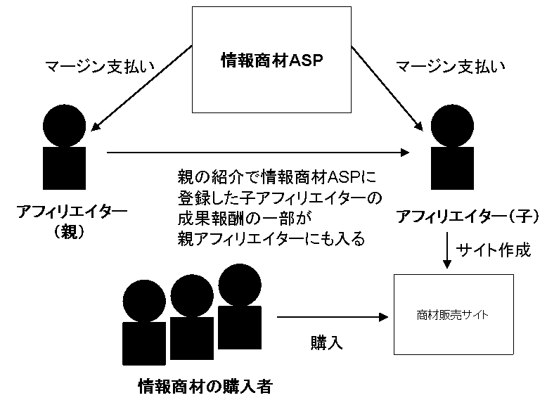 さらに2ティア(2段階プログラム)という仕組みも提供している情報商材ASPもある。これはASPの既存会員(親)の紹介でASPと契約したアフィリエイター(子)に売り上げが上がると、一定のマージンが親アフィリエイターにも支払われるという仕組みだ。このマージンはどちらも出品者側の負担となる。
