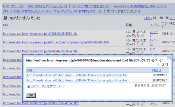また、表示される表の各行の[リンク元]列に出ている「1ページ」などをクリックすると、各URLについて、そのURLにリンクを張っているページを確認することもできます。
