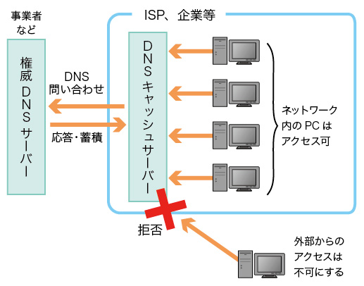 DNSサーバーは、その役割によって2種類に分類される。1つはドメイン名の情報を格納している権威DNSサーバーで、ドメイン名の登録者や、その運用を預かるレンタルサーバー事業者などが運用する。もう1つは、ユーザーからの要求を受けて権威DNSサーバーを検索し、その情報を蓄積するDNSキャッシュサーバーで、ISPなどが会員ユーザーに提供するために運用する。