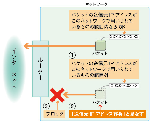 DNSリフレクション攻撃は、送信元IPアドレスの詐称により可能となります。そもそも、インターネットにおいて送信元IPアドレスを詐称することがあってはいけません。このため、ネットワークの運営者は、自分のネットワークとインターネットとの境界において、インターネットへ出て行こうとするデータの送信元IPアドレスを確認し、それが自分のネットワークのものでない場合は詐称していると判断してフィルタリング対象とすべきです。これを「イングレスフィルタリング」と言います(図4)。