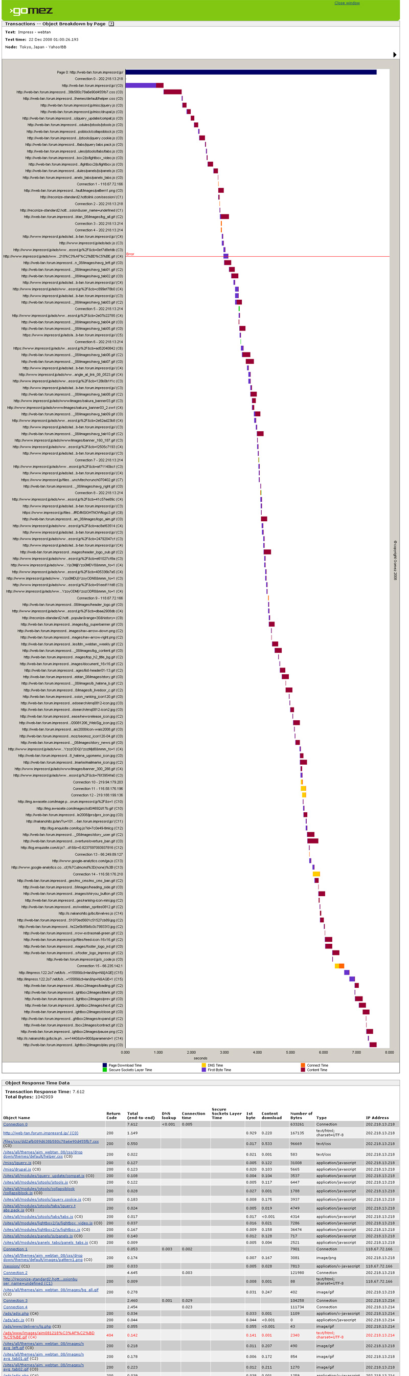 1ページ全部表示されるまでに、7.6秒かかっています。最初のコネクション0というのがDNSによってクライアントがホストを見つけて最初コネクション張られるまでのことですが、これはかなり速い。問題は次のファーストバイトですね。サーバーにリクエストが届いてコンテンツが返される時間ですが、1秒というのはかなり長い。ここが遅いのは、サーバーのレスポンスが遅いか、もしくはサーバーの後ろで動いているデータベースが遅い。ということは、サイジングやアプリケーションのチューニングに何らかの問題があるかもしれないということがわかるわけです。逆に、全体のパフォーマンスが遅くても、ファーストバイトが速い場合は、マシンの増強やデータベースのチューニングをしても改善されません。
