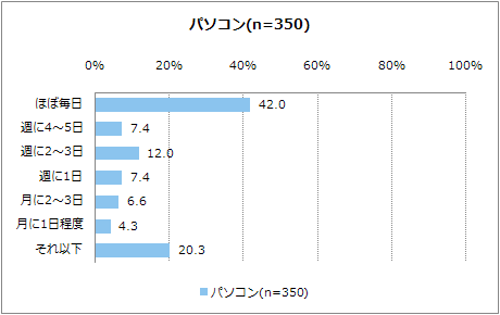まずは、パソコンと携帯電話の双方におけるインターネットの利用頻度を尋ねた(図1)。「ほぼ毎日」という回答では携帯電話が64.0%、パソコンが42.0%という結果となった。ユーザーに最も近い位置にあるメディアと呼ばれる携帯電話の利用頻度の高さがうかがえる結果であるが、今回の調査がモバイルのネットリサーチによって行われていることも影響していると考えられる。