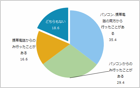 デバイス別にみると、「パソコン、携帯電話の両方から行ったことがある」が35.4%で最も高く、パソコンのみの比率が29.4%、携帯電話のみの比率が16.6%という結果となった。図1のようにデバイス別のインターネットの利用頻度に差がみられることからも、ユーザーはパソコンと携帯電話を使い分けてオンラインショッピングをしているといえる。
