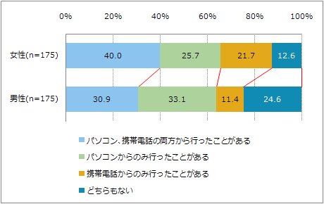 デバイス別のオンラインショッピングの利用経験を男女別にみると、「パソコン、携帯電話の両方から行ったことがある」と回答したユーザーは、女性で40.0%、男性で30.9%と10ポイント近い差があることがわかった。また、女性は携帯電話からのみの比率が男性に比べて10ポイントほど高く、反対に男性はパソコンからのみの比率が女性に比べ7ポイント以上高い結果となっている。