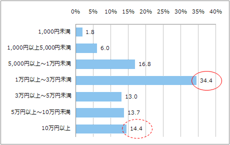 前問で、オンラインショッピングを利用したことがあると回答した285人に対して、今までに購入した商品の中で「最も高かった金額」と「最も安かった金額」を尋ねた。その結果、「最も高かった金額」では「1万円以上~3万円未満」が34.4%で最も高く、次いで「5,000円以上~1万円未満」の16.8%となる。オンラインショッピングにおける一般的なユーザーの上限金額はおおよそこの3万円程度であることがうかがえる(図4)。