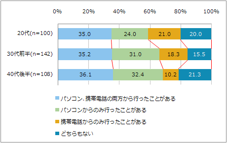 - いずれの年代においても3割強がパソコンと携帯電話の両方でオンラインショッピングを行っている