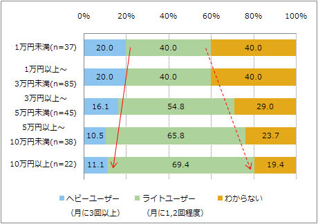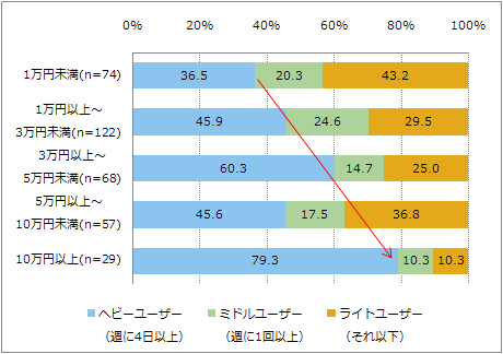 モバイルインターネットに関してはパソコンとは異なり、金額が低いユーザーほどヘビーユーザーの比率が高い(図10)。ただし、ライトユーザーまでを含めると金額に応じて利用頻度が高まる傾向はパソコンと変わらない。