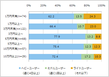 モバイルインターネットに関しては、最もヘビーユーザーが少ない層(自由に使えるお金が「1万円未満」)においても60%以上のユーザーが週に4日以上利用すると回答しており、パソコンに比べて高いネット利用率がうかがえる(図8)。