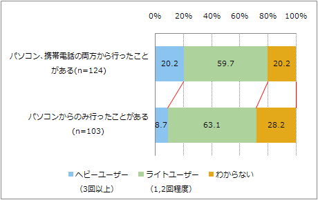 - パソコンと携帯電話の両方からインターネットを利用しているユーザーは、パソコンのみのユーザーに比べ、オンラインショッピングの利用頻度が高い