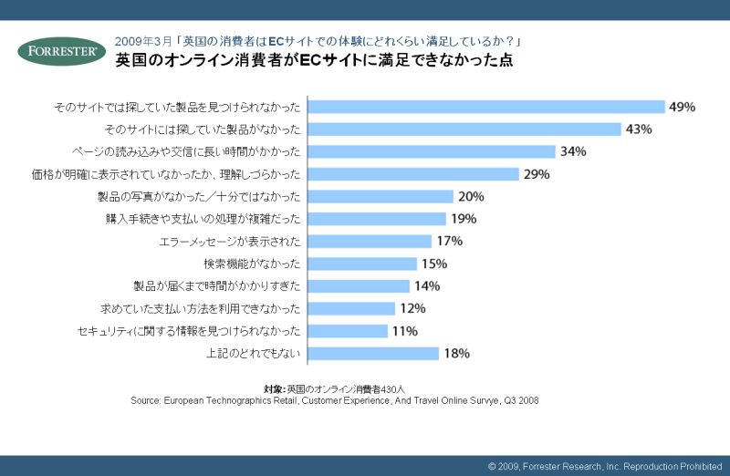 しかしながら、使ったWebサイトに関して不満を述べた消費者にその不満の理由を聞いたところ、ほぼ万国共通の回答が出てきました。どの国でも、最も回答が多かった不満の理由は、「そのサイトでは探していた製品を見つけられなかった」「そのサイトには探していた製品がなかった」の2つでした。これらは、どちらかと言えば基本的な欠点ですよね。
