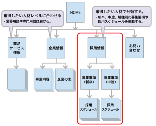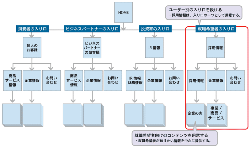 Webサイトの構造は、自社のサイトに訪れるユーザーにどのような人がいるのかによって決まります。Webサイトを訪れるさまざまなユーザーにとって一番大切なことはどこに行けば自分の欲しい情報があるかが一目瞭然であるということです。ゆえに、ユーザー別に入り口を設け、それぞれが求めるコンテンツに振り分けるという考え方がWebサイトには必要なのです。